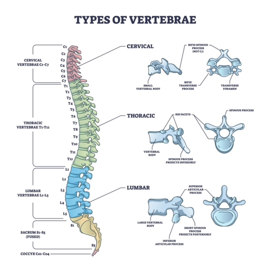 The spine is divided into three segments from top to bottom: Cervical, Thoracic and Lumbar.