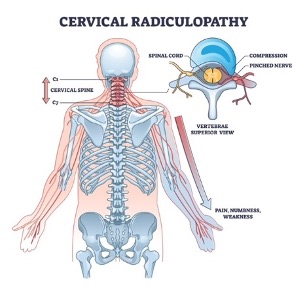 When a herniated disc causes pinching of the nerve in the neck, this can result in neck pain shooting down the arm called radiculopathy. Some people experience tingling, numbness or even weakness of the arm. In this case since the pinched nerve is in the neck it is called cervical radiculopathy.