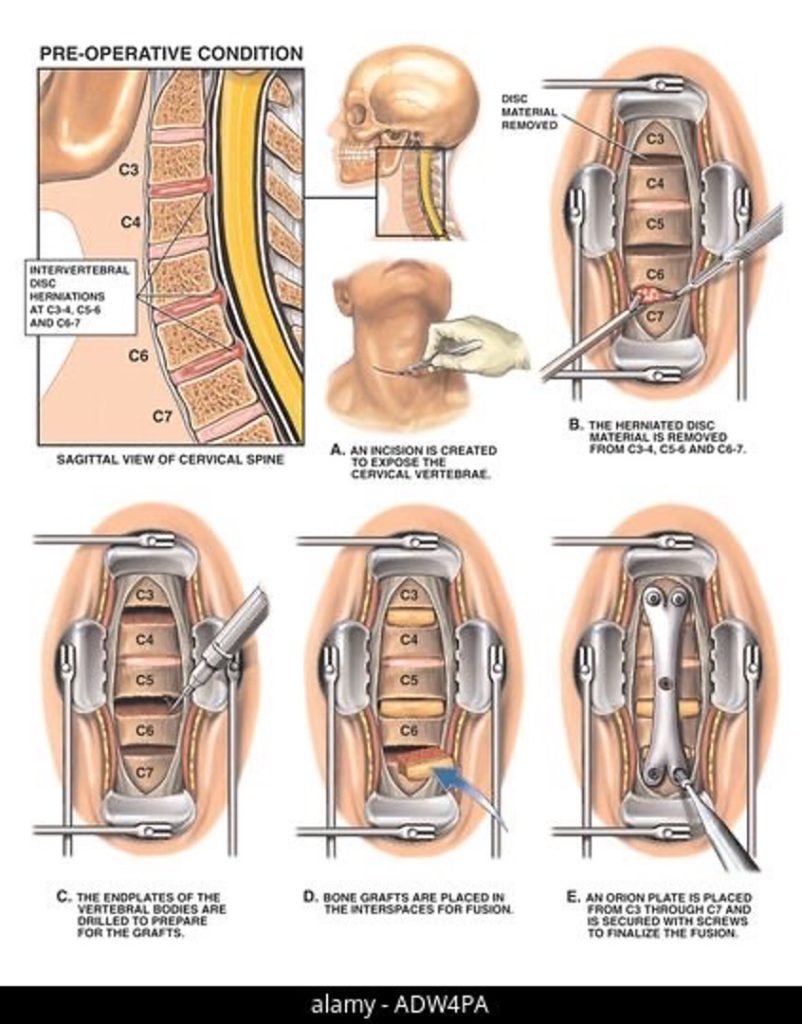 The surgery for herniated disc of the cervical spine is usually the Anterior Cervical Diskectomy and Fusion. It is sometimes called ACDF surgery. When performing ACDF surgery, your neurosurgeon usually makes an incision in the front part of your neck, removes the herniated disc and replaces it with a piece of bone. A metal plate, usually made of titanium is often screwed on to the spine to hold everything together until your spine grows bone across the area of the surgery, thus achieving spinal fusion. Spinal fusions are also performed in other parts of the spine.