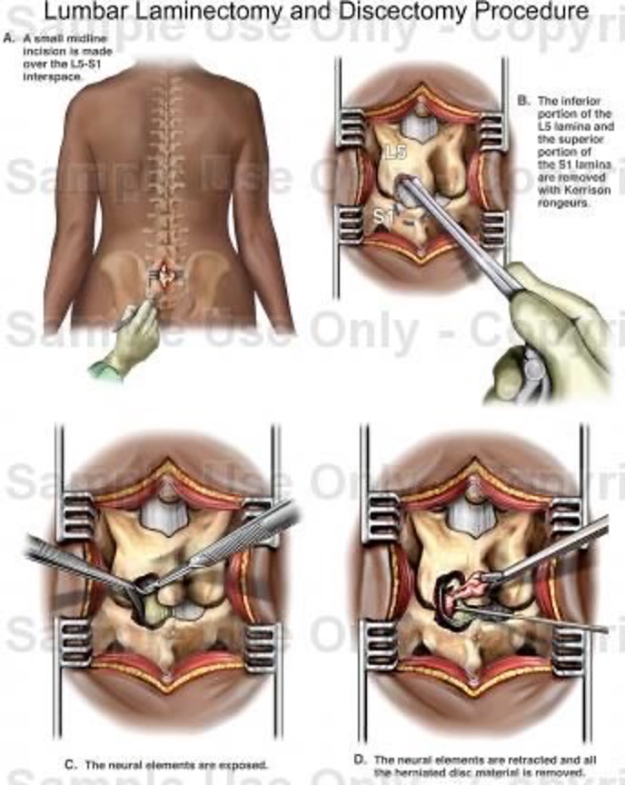 Surgery for Lumbar herniated disc usually involves performing a lumbar laminotomy with diskectomy or lumbar laminotomy with diskectomy. Whether lamintomy or laminectomy is performed depends on how much of a window through the bone needs to be created to remove the herniated disc. During the procedure your neurosurgeon usually removes the portion of the disc that is pressing on the nerve.
